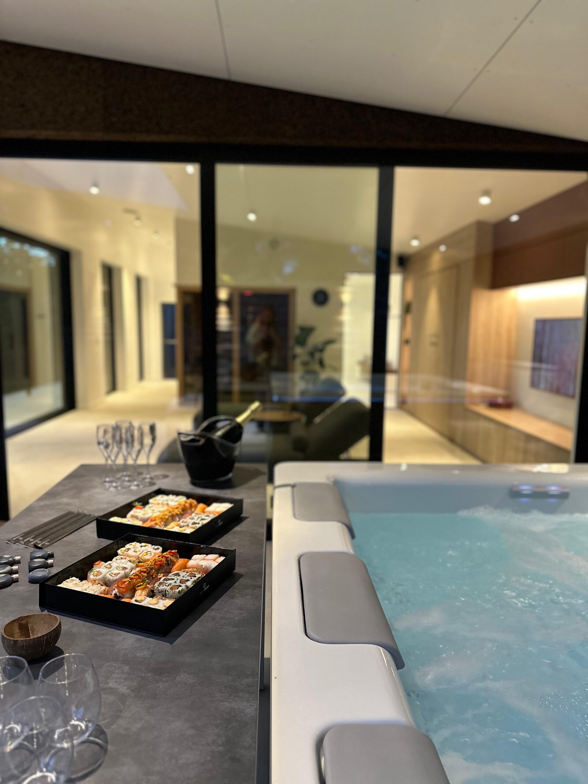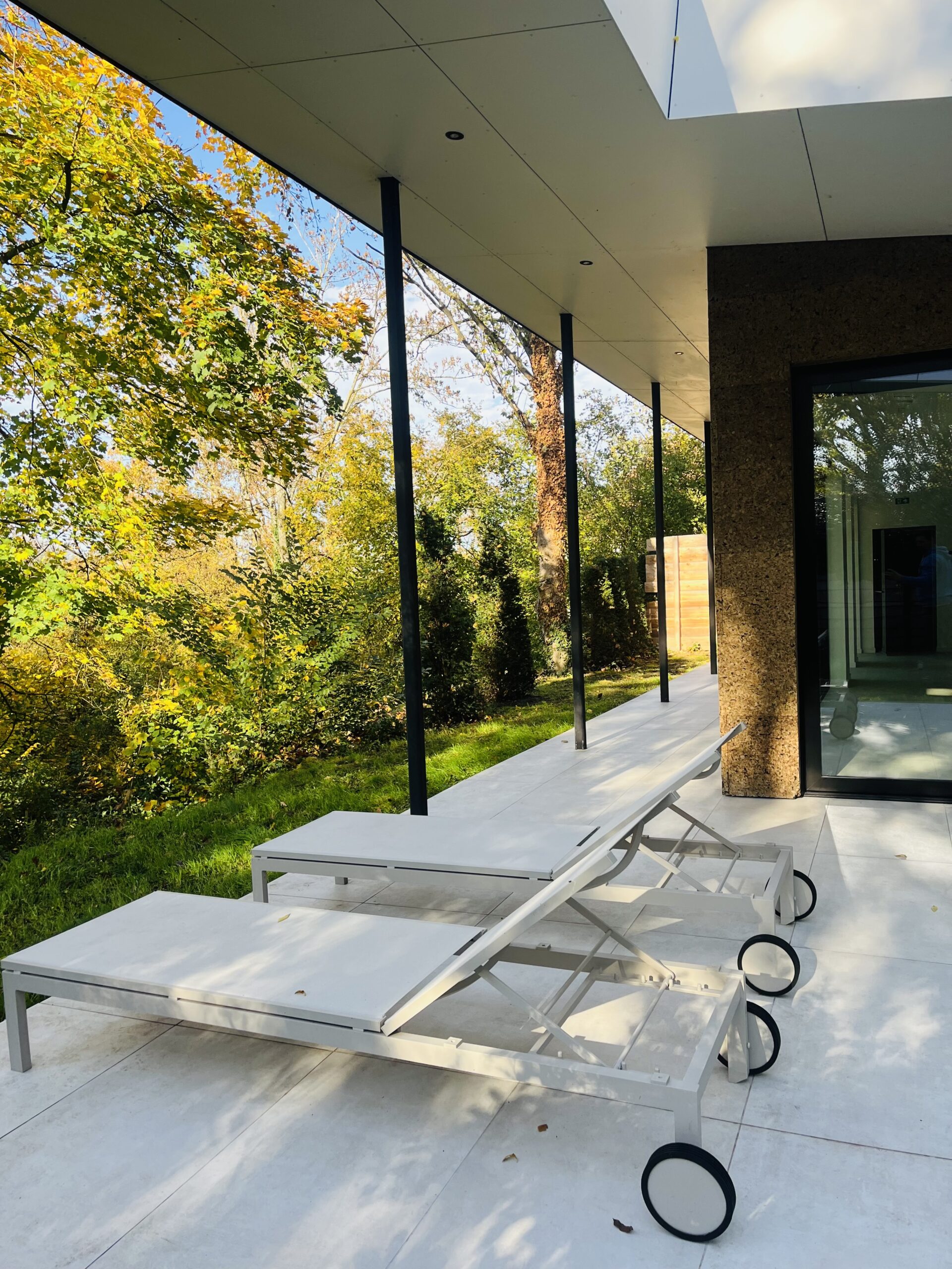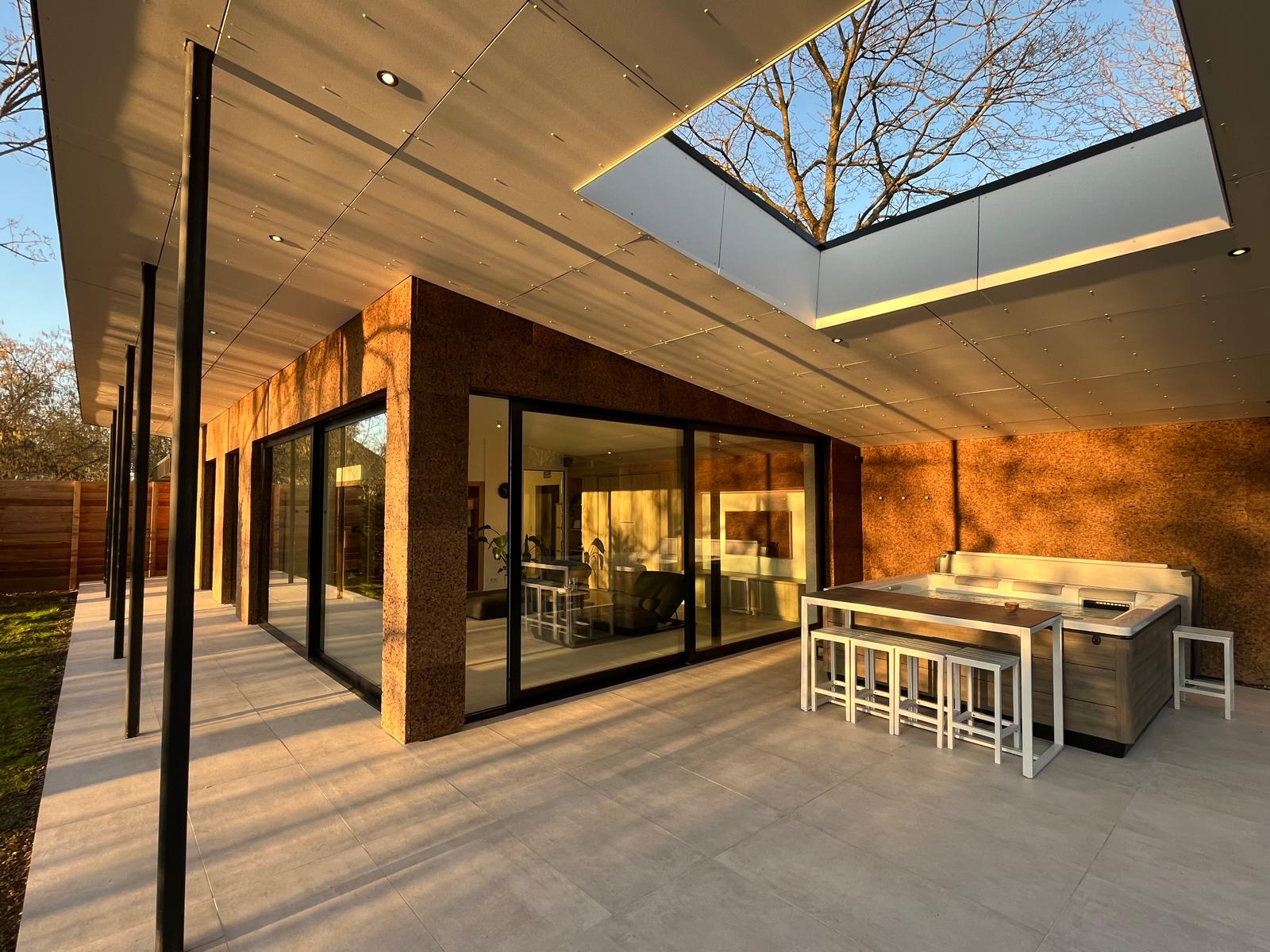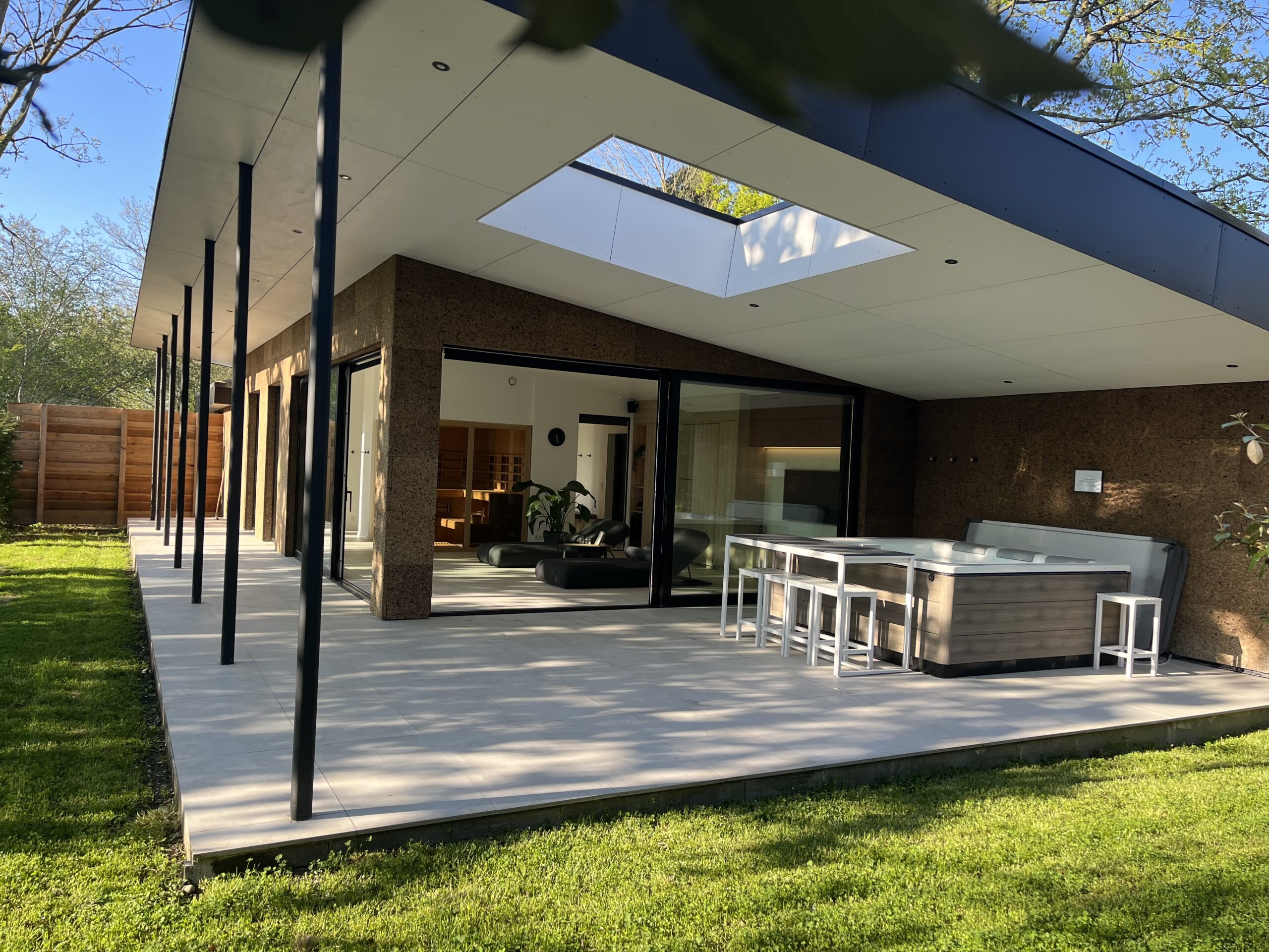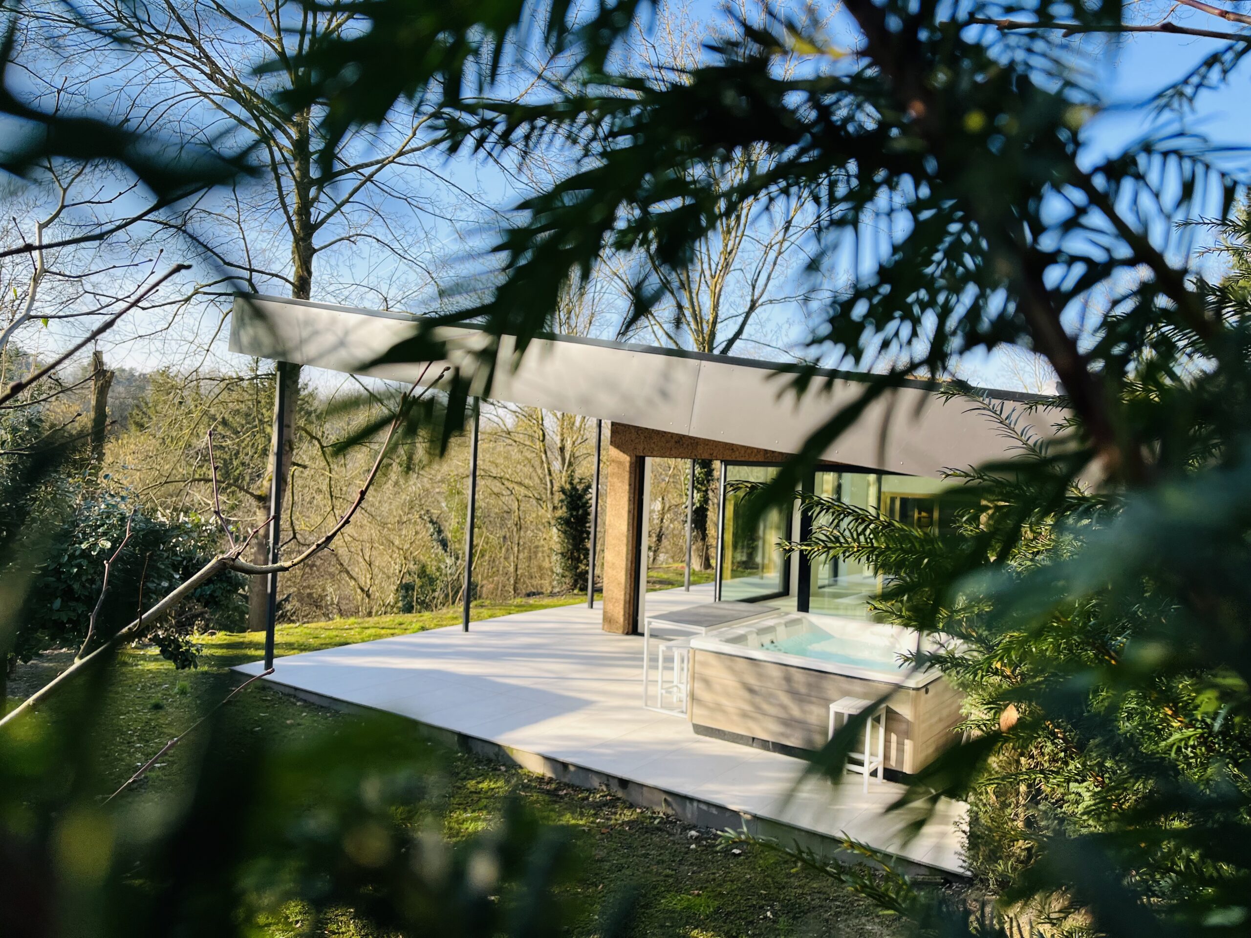 Cette photo montre la terrasse couverte du Pavillon Private Spa à Rixensart, dans le Brabant wallon en Belgique, à seulement quelques minutes de Bruxelles. Avec son jacuzzi privatif, son architecture moderne et son puits de lumière, cet espace extérieur offre une expérience de bien-être haut de gamme dans un cadre naturel exceptionnel.