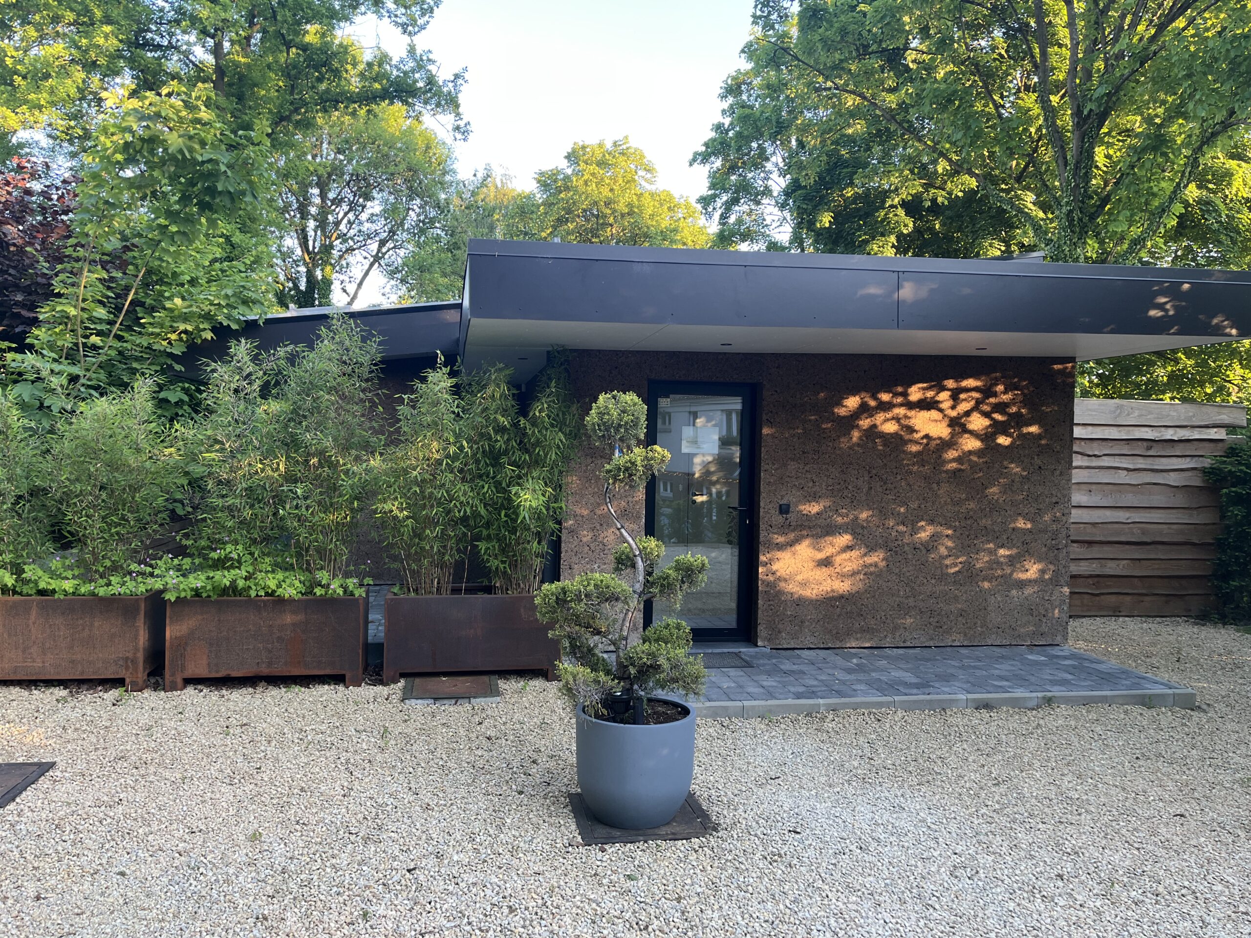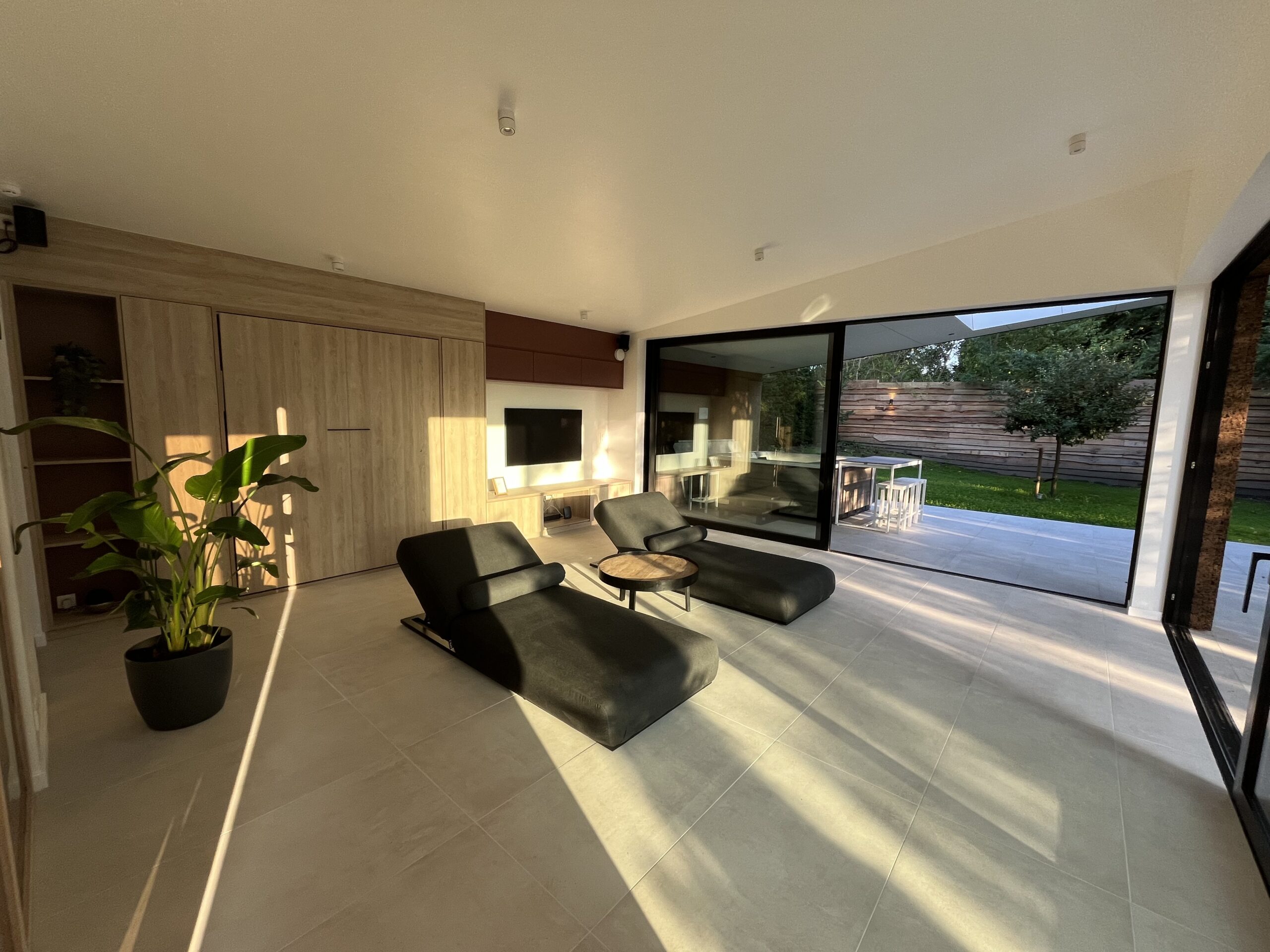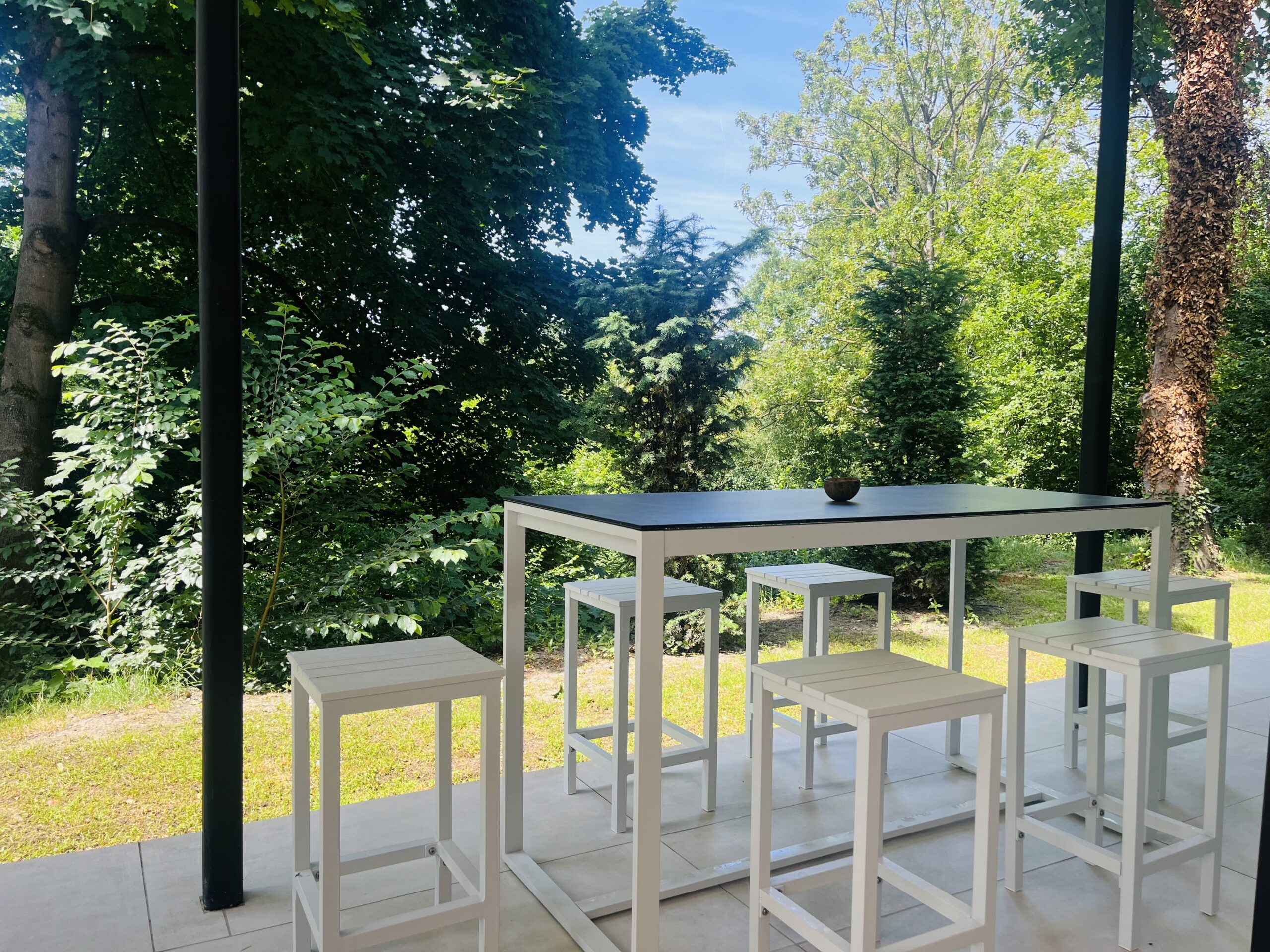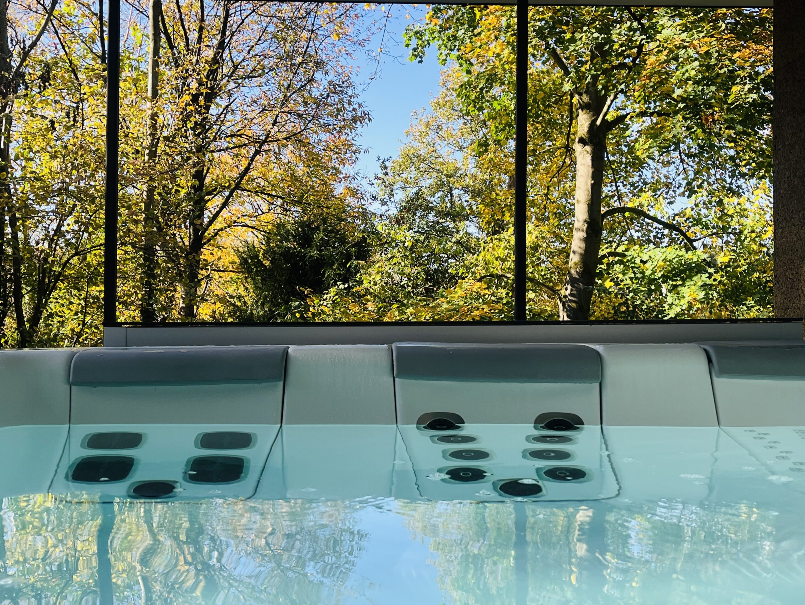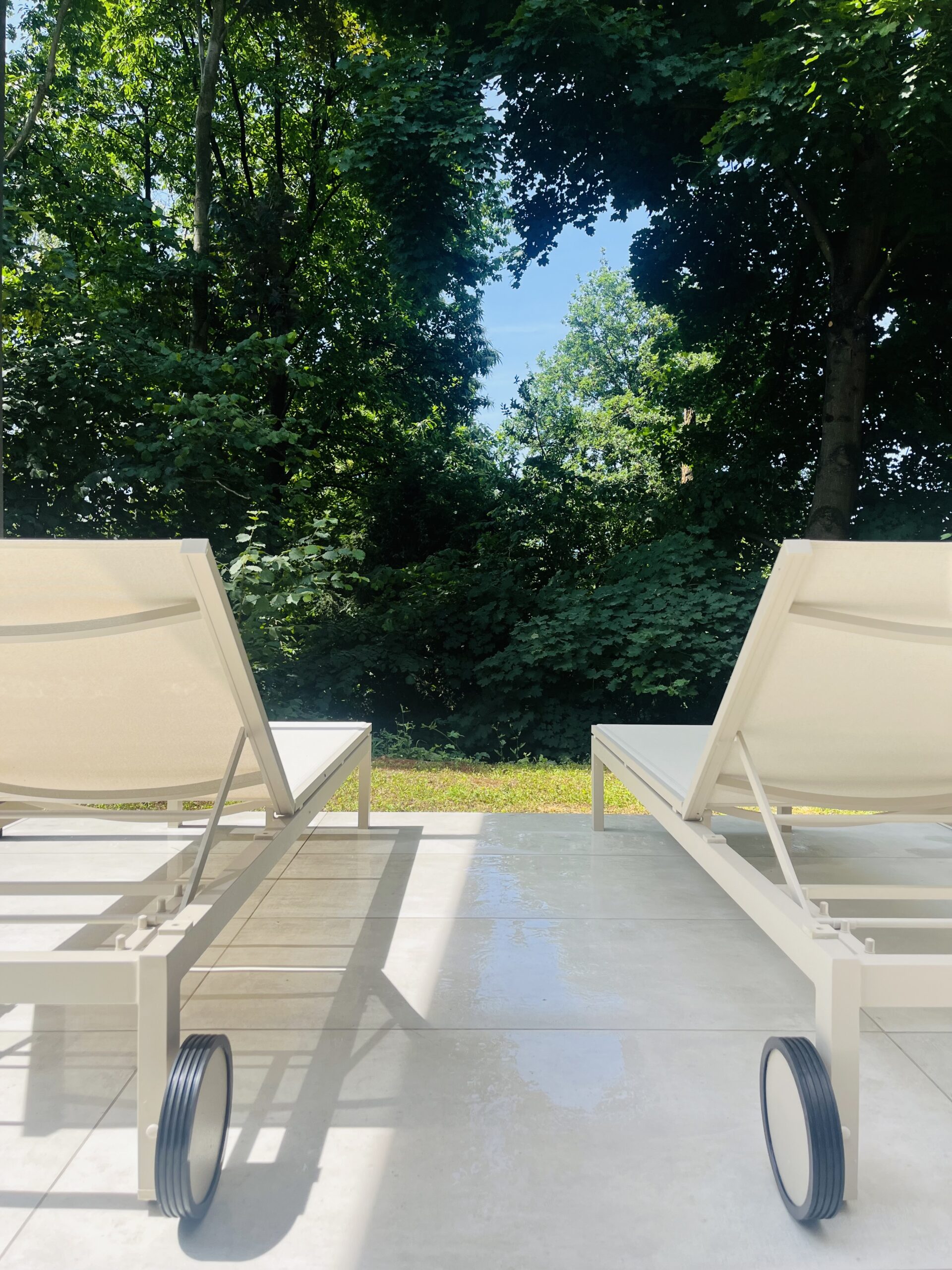 Cette photo montre la terrasse couverte du Pavillon Private Spa à Rixensart, dans le Brabant wallon en Belgique, à seulement quelques minutes de Bruxelles. Avec son jacuzzi privatif, son architecture moderne et son puits de lumière, cet espace extérieur offre une expérience de bien-être haut de gamme dans un cadre naturel exceptionnel.