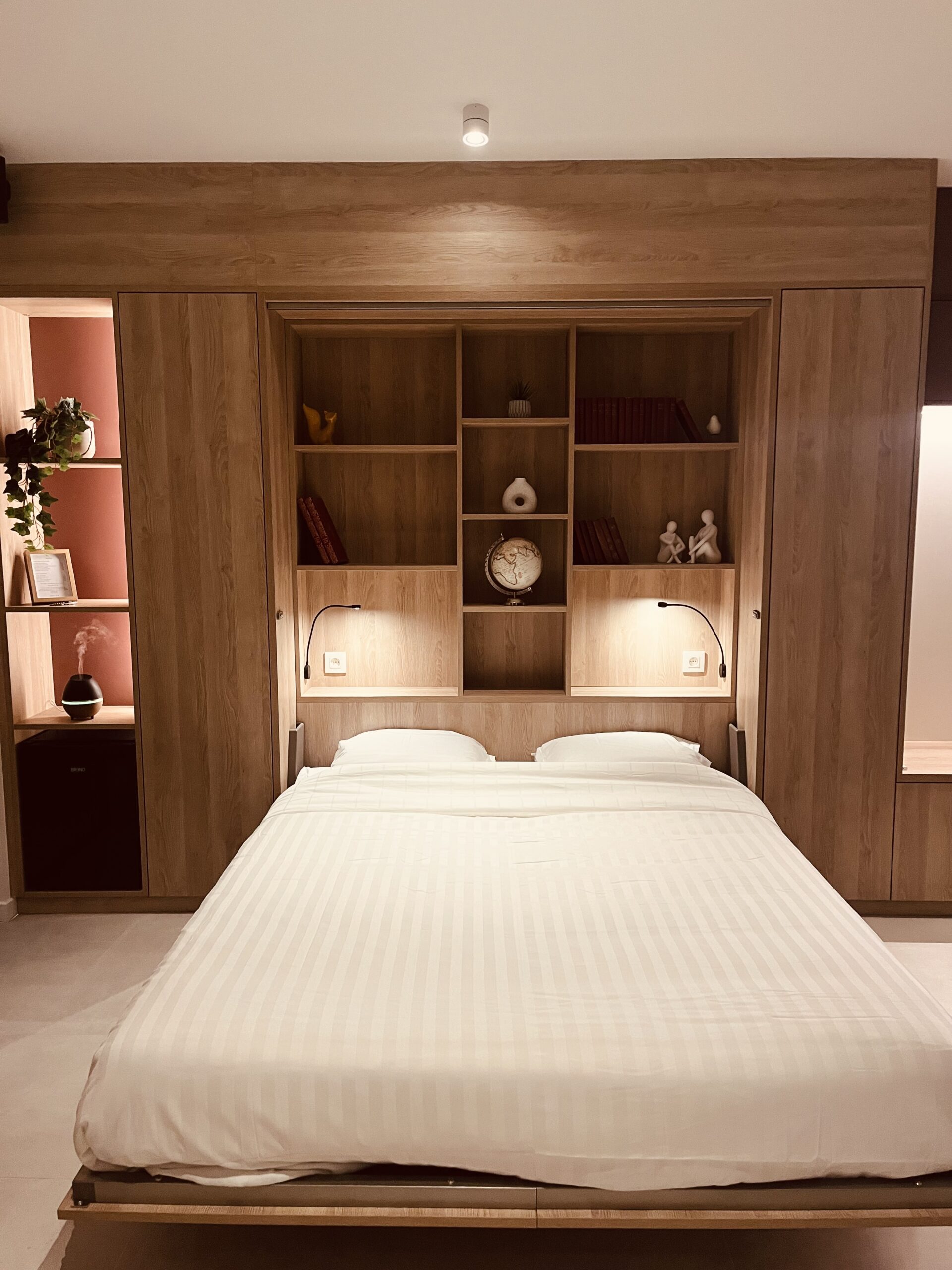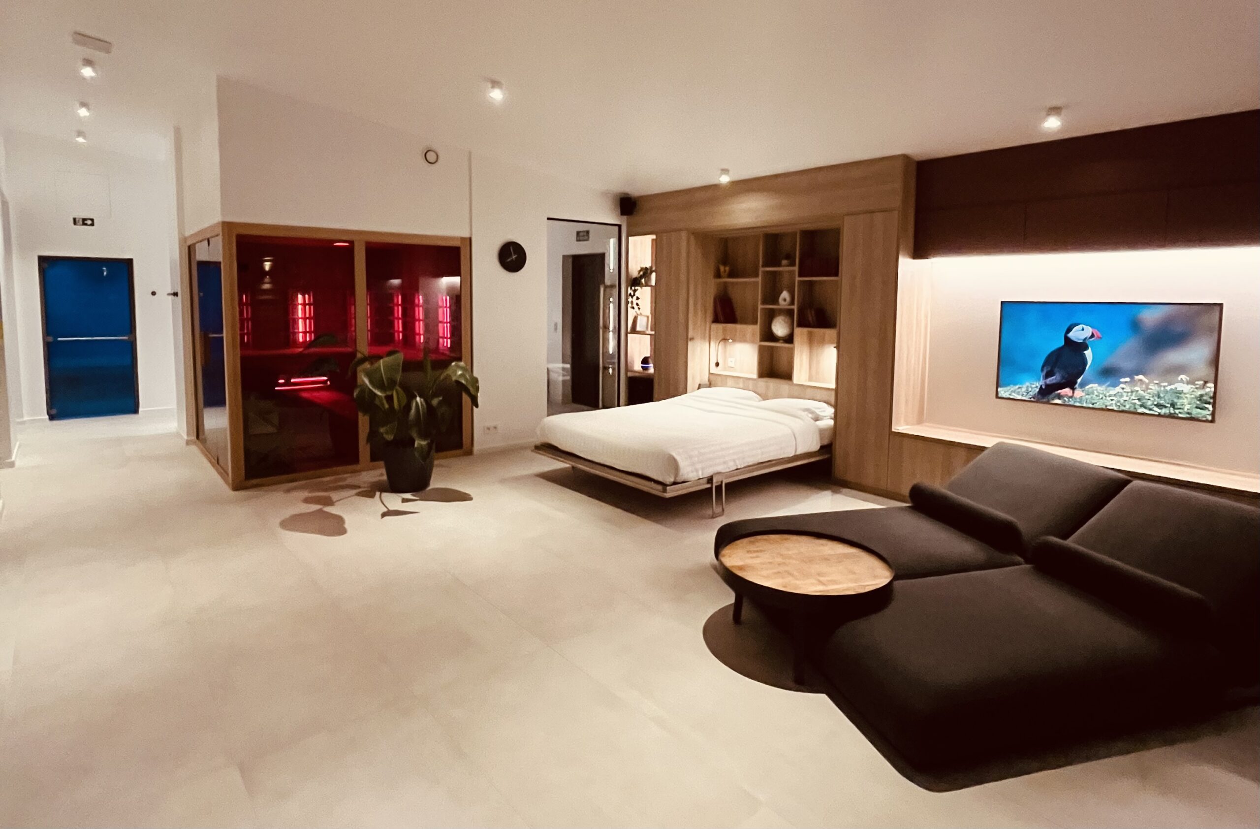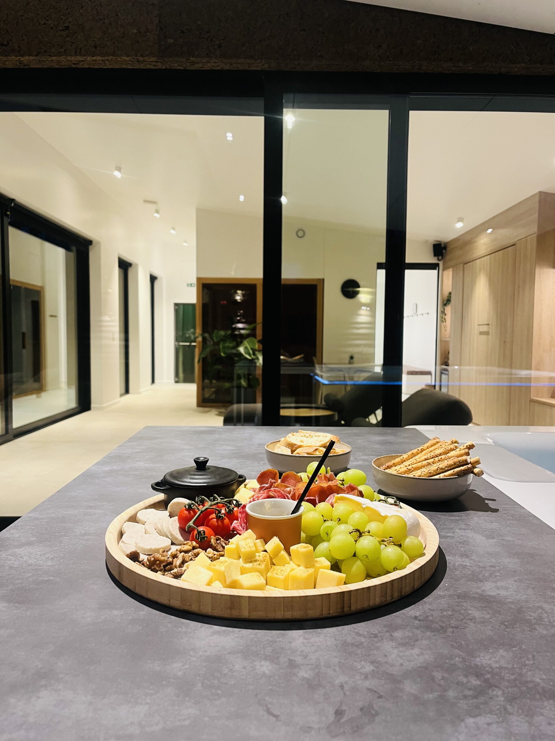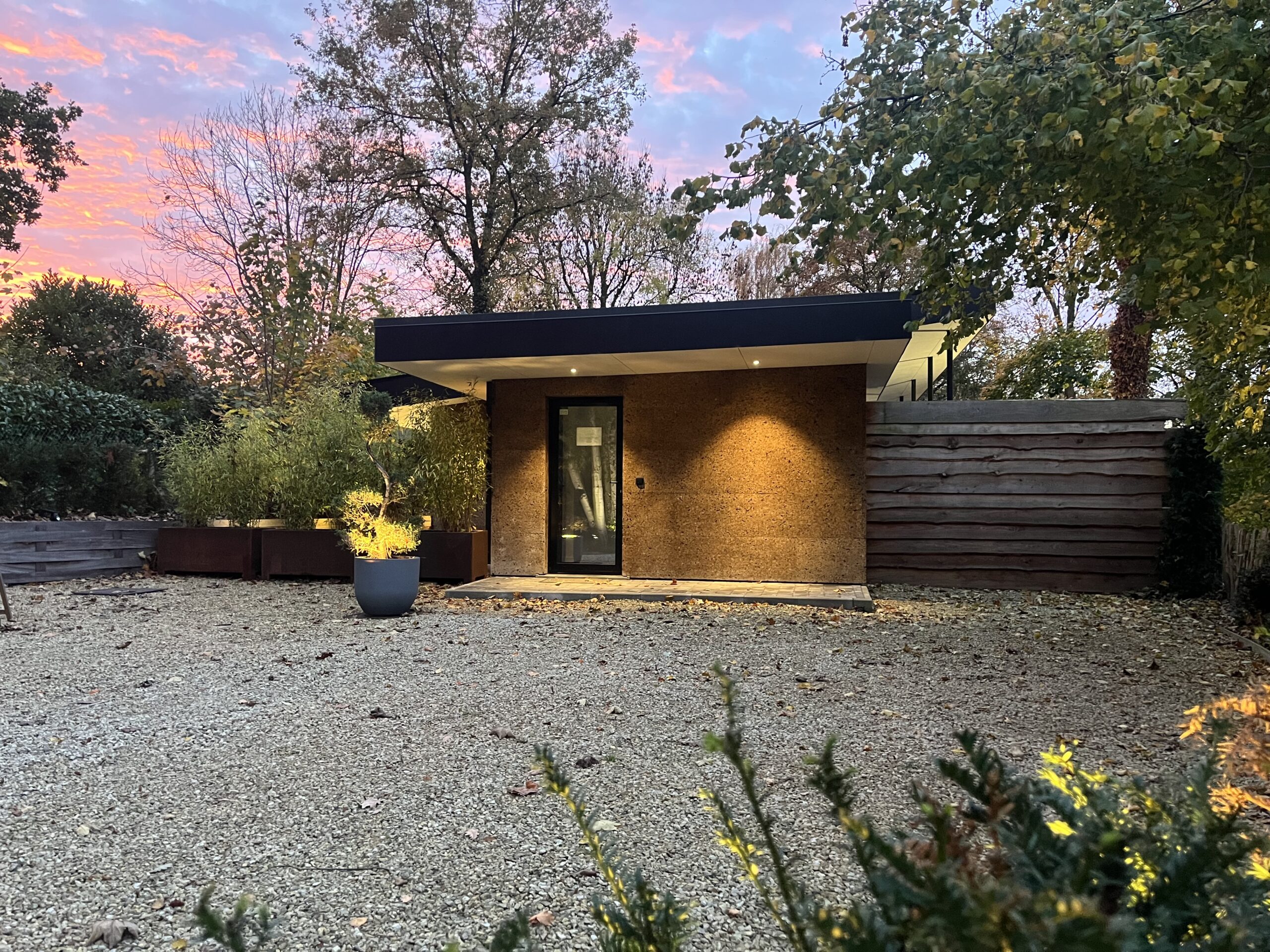 Une terrasse élégante avec jacuzzi et puits de lumière, baignée par les rayons du soleil couchant, dans un spa privatif situé en Belgique, à deux pas de Bruxelles.